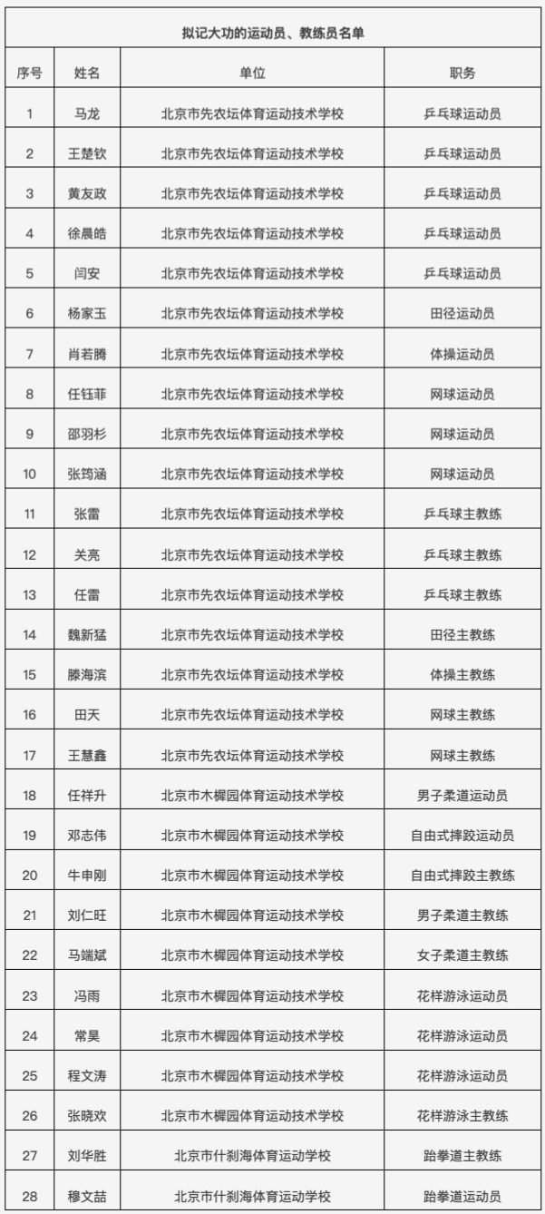 北京市体育局公示,在第十五届全国运动会,北京体育健儿顽强拼搏、团结协作,圆满完成参赛任务,为首都体育事业再创佳绩。依据《北京市事业单位工作人员奖励实施办法》等文件规定,市人力资源社会保障局会同市体育局对在第十五届全国运动会上作出杰出贡献的北京运动员和教练员,开展记大功奖励工作。根据奖励工作部署,在有关单位积极推荐的基础上,经综合评审、统筹考虑,确定北京乒乓球运动队等9个集体配资推荐网,马龙等28位同志拟记大功对象。