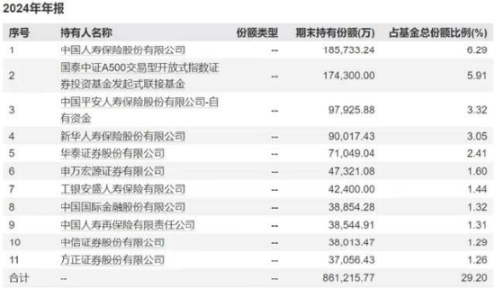 此外,从资金流向来看,根据中证A500ETF(159338)2024年年报,像险资这种长线资金,将中证A500视为核心配置,从前十大持有人来看,很多保险机构,大比例持有中证A500ETF(159338),持有份额最高超过18亿元。